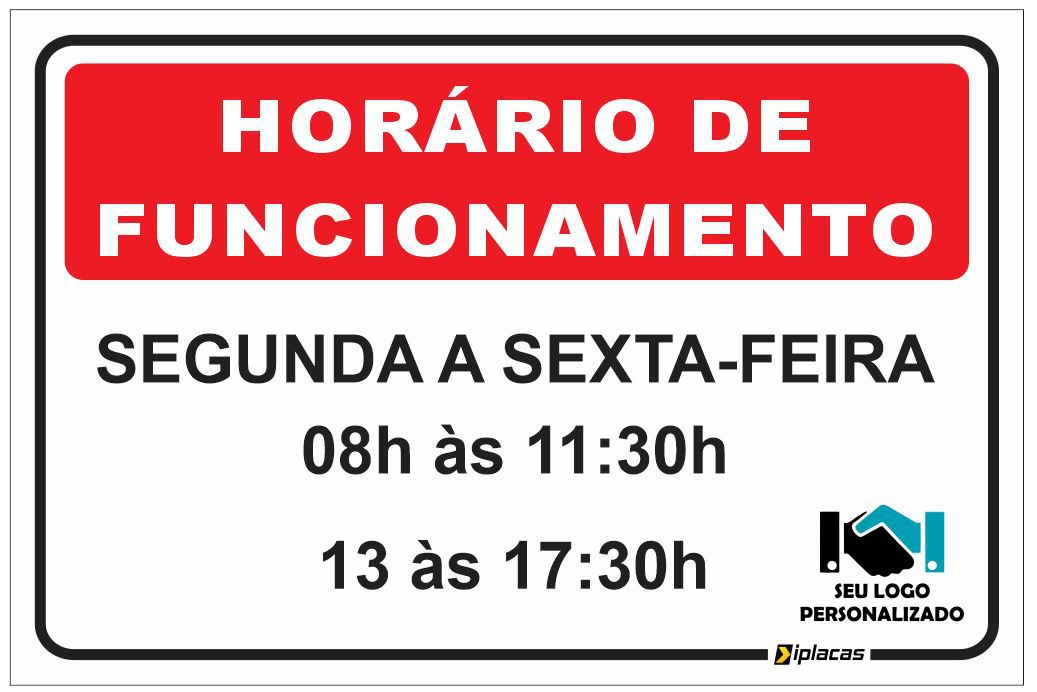 As placas são personalizadas, informar no ato da compra o horário de funcionamento e enviar o logo em JPG, Corel, PDF ou Photoshop em boa resolução.